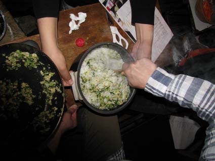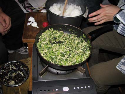 5 ご飯が炊けたら、サクサン、チンゲンサイ、塩少々を加え、よく混ぜ、10分ほど蒸らす。