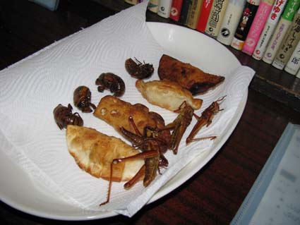 1 セミ(腹部に少し切れ目をいれる)、イナゴを1頭づつ別々に串にさす。