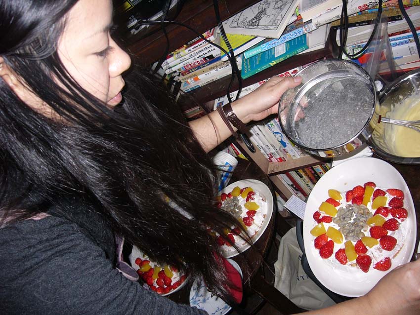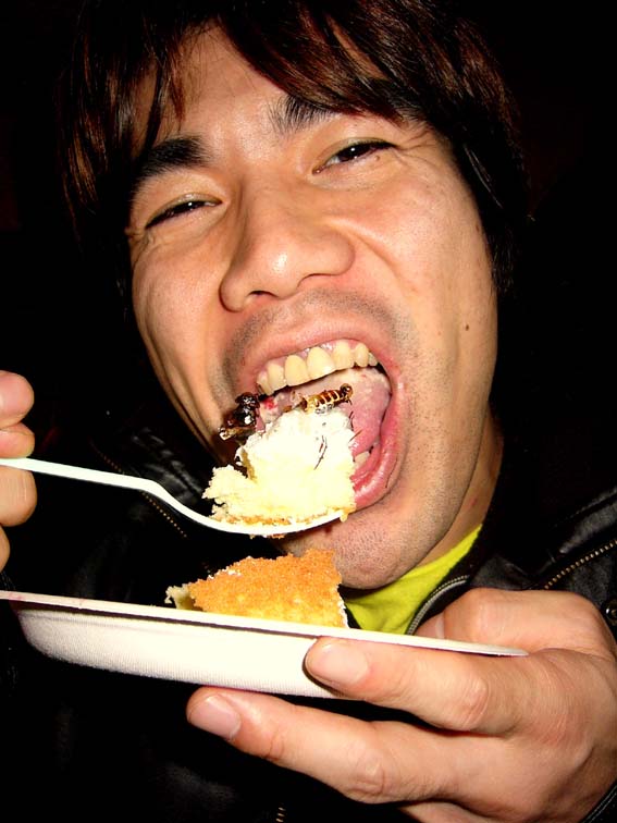 スポンジケーキにホイップクリームをぬり、フン抜きして茹でたスズメバチ幼虫をしきつめ、揚げたその他の虫を飾り、フルーツを添える。