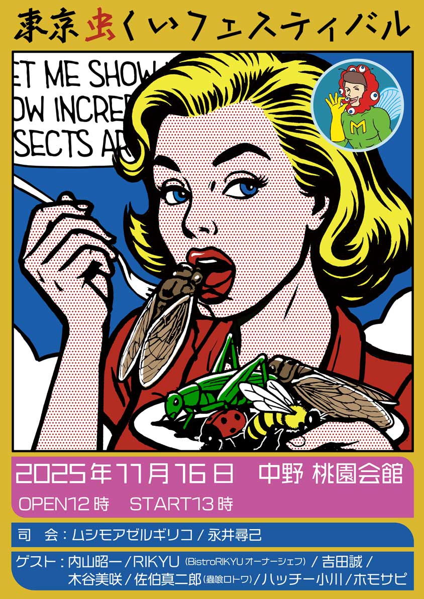 今年のテーマはガチ勢最前線。世界で日本でそれぞれの考える昆虫食を楽しみ続ける人たちが今語りたい注目のトピックスは? 昆虫食界のセンター内山昭一を囲む、カラフルなメンバーで楽しいトークをお届けします