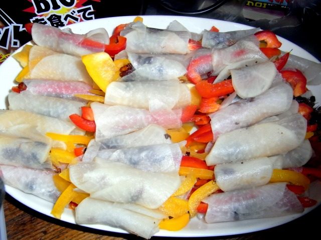 4 サンムにパプリカと揚げた虫をいれて巻き、紙コップにさす